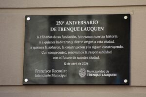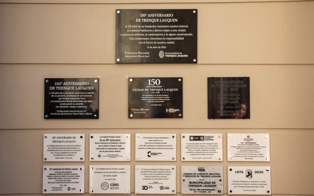 El intendente Francisco Recoulat acompañó a los representantes de cada institución en el descubrimiento de las placas. La primera fue precisamente la de la Municipalidad de Trenque Lauquen, que el propio Intendente descubrió y que dice “A 150 años de su fundación, honramos nuestra historia y a quienes habitaron y dieron origen a esta ciudad, a quienes la soñaron, la construyeron y la siguen construyendo. Con compromiso, renovamos la responsabilidad con el futuro de nuestra ciudad”.