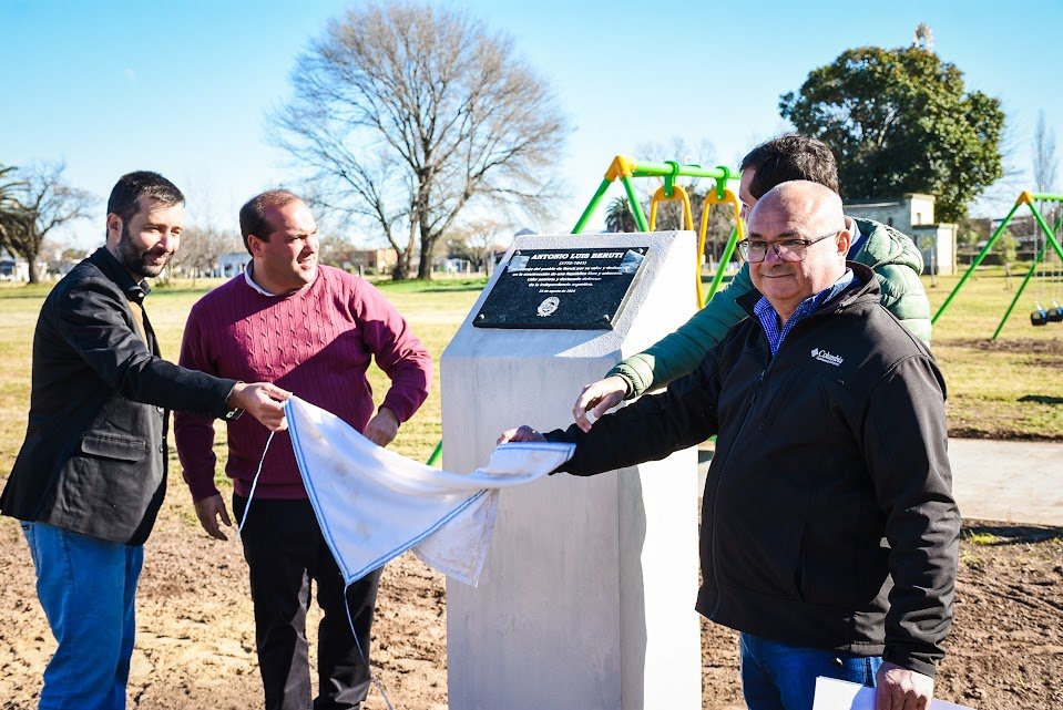 Como parte de las actividades conmemorativas por el 134° aniversario de la fundación de la localidad de Beruti, se realizó esta mañana (domingo) el descubrimiento de una placa en homenaje al prócer Antonio Luis Beruti en el predio de la Escuela Municipal, que funcionará como un espacio de reflexión histórica y conocimiento, y también educativo y de recreación para toda la comunidad, con el objetivo de enaltecer los valores que transmitió su accionar y su lucha en el movimiento emancipador de nuestra Nación.
