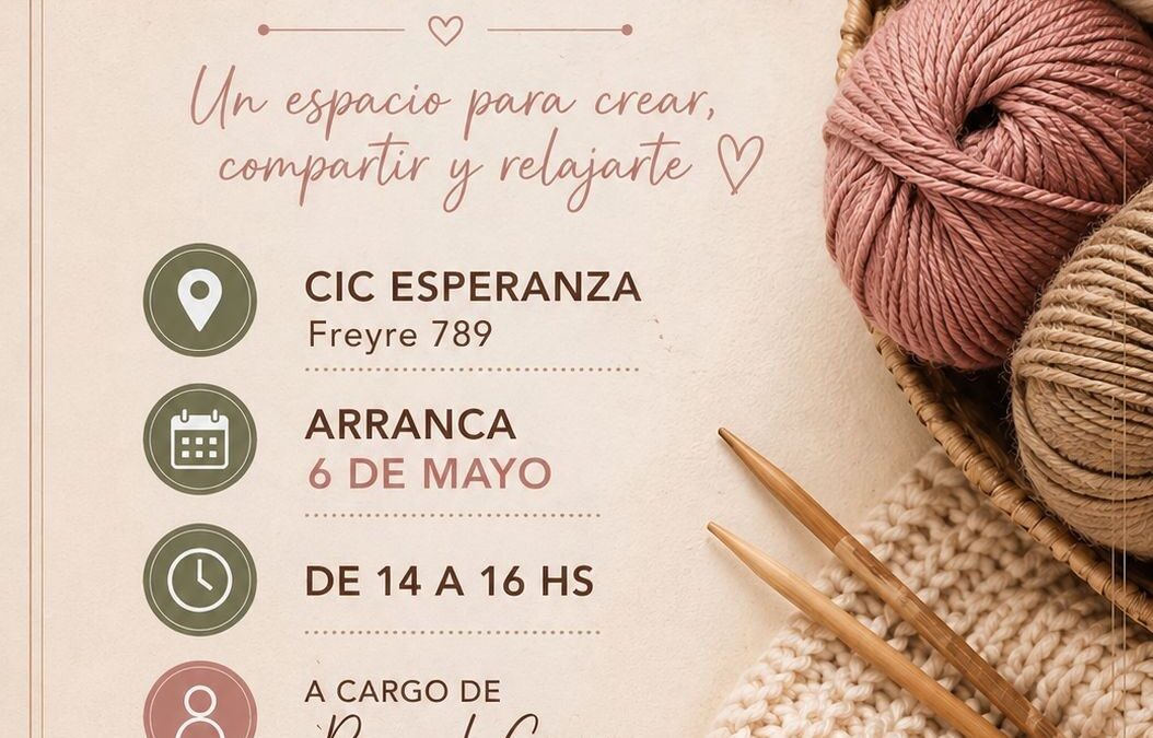 El Taller de Tejido comenzará el próximo 6 de mayo y se dictará los martes de 14 a 16 h, en la sede del CIC ubicada en Freyre n.º 789. Estará a cargo de Raquel Crespo y está destinado tanto a personas que se inician como a quienes ya cuentan con experiencia. La propuesta invita a crear, compartir y disfrutar de un momento de relajación a través del tejido.