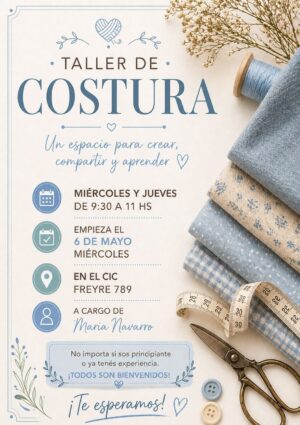 Por su parte, el Taller de Costura también iniciará el 6 de mayo y se desarrollará los miércoles y jueves de 9.30 a 11 h, en el mismo espacio. Estará a cargo de María Navarro y está orientado a principiantes y a quienes deseen perfeccionar sus conocimientos.