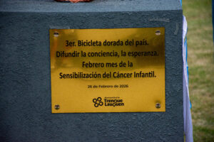 A continuación, se descubrieron dos placas, una de ellas con el siguiente mensaje: “Tercera bicicleta dorada del país. Difundir la conciencia, la esperanza. Febrero, mes de la sensibilización del cáncer infantil”.