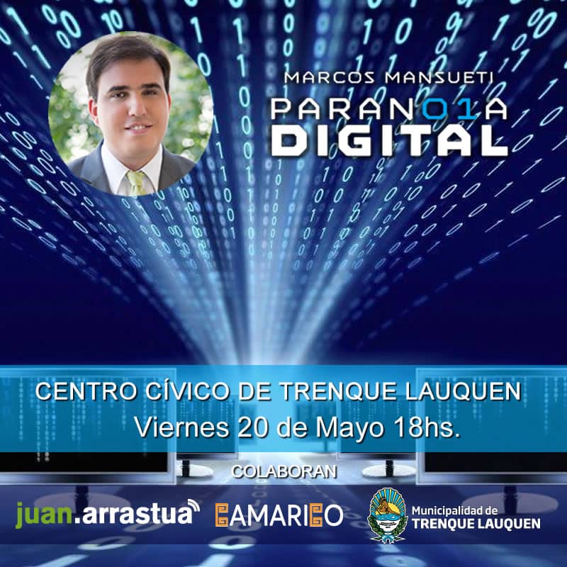 La Municipalidad de Trenque Lauquen adhiere a la presentación del libro “Paranoia digital” de Marcos Mansueti, que se realizará el viernes 20 de mayo a las 18 hs. en el Centro Cívico “La Primera”.