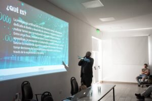 Durante la charla, Mauvecin explicó que “la Inteligencia Artificial es una rama de las ciencias computacionales dedicada al diseño o desarrollo de sistemas o máquinas capaces de realizar tareas que normalmente requieren inteligencia humana; entre otras cosas incluye procesos como el razonamiento, aprendizaje, la percepción y la adaptación a nuevos contextos, todas capacidades de aprendizaje de la inteligencia humana y la IA se basa en la creación de algoritmos que procesan información y toman decisiones de forma Autónoma mejorando con el tiempo a través de la experiencia y los datos”.