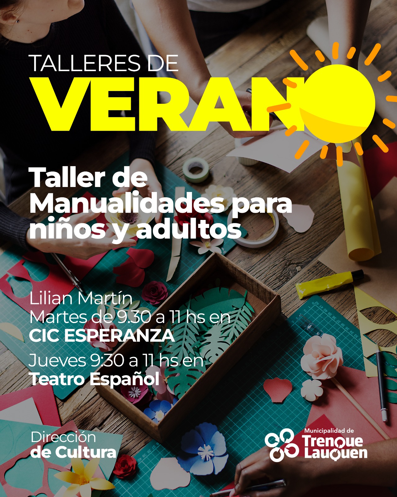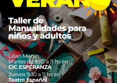 – Taller de Manualidades para niños y adultos, a cargo por Lilian Martín. Los martes de 9.30 a 11 en el CIC del Barrio Esperanza y los jueves de 9.30 a 11 en el Teatro Español.