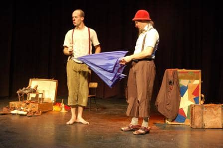La obra está narrada sin diálogos entre los dos personajes protagonistas, sostenida a través de técnicas de clown, con malabares y magia incluidos.