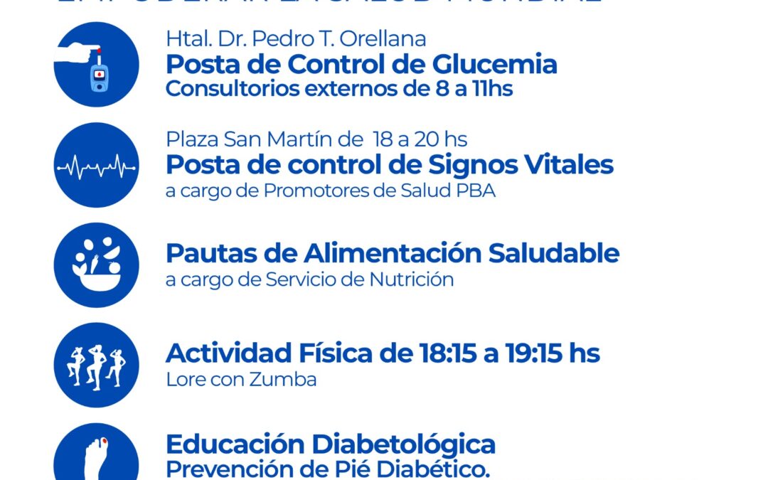 Las actividades se prolongarán por la tarde del mismo jueves (14) en la Plaza San Martín donde habrá cuatro postas en simultáneo entre las 18 y 20 horas: Una posta con promotores de la salud controlando signos vitales, tensión arterial y glucemia; otra donde va a estar el Servicio de Nutrición del Municipio también brindando información sobre los planes alimentarios y educación alimentaria; una tercera posta con una propuesta con actividad física que en este caso va a ser baile zumba a cargo de la profesora Lorena Campelo; y en la otra posta va a estar el Servicio de Endocrinología del Hospital Municipal.