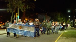 La Vigilia – antesala del acto oficial que tendrá lugar esta mañana a partir de las 10 en el monumento emplazado en el ingreso a la Ampliación Urbana- y que contó con el acompañamiento del intendente Francisco Recoulat se inició con una caminata encabezada por el grupo de veteranos y familiares que portaban la bandera nacional y que partió del playón del Ferrocarril, en silencio y con velas encendidas, y que recorrió la Avenida Villegas hasta la Plaza San Martín, donde los vecinos/as que los esperaban los recibieron con aplausos.