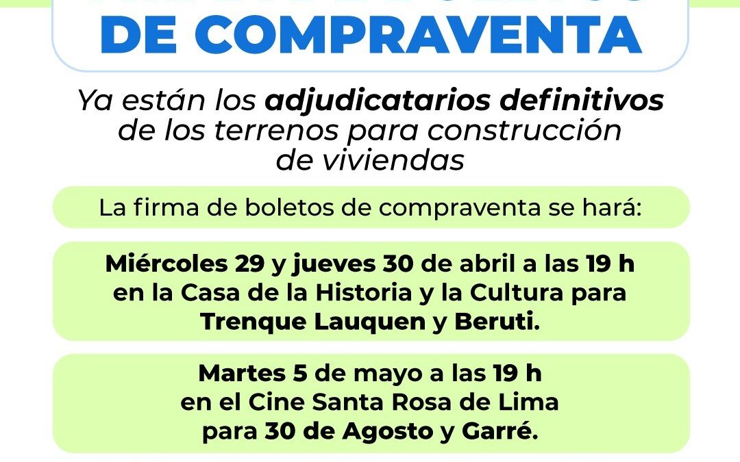 Los adjudicatarios definitivos de las ciudades de Trenque Lauquen y Beruti firmarán los boletos de compraventa los días miércoles 29 y jueves 30 de abril a las 19 h en la Casa de la Historia y la Cultura, ubicada en el Parque Municipal “Conrado Villegas”, en la esquina de Belgrano y Scalesse.