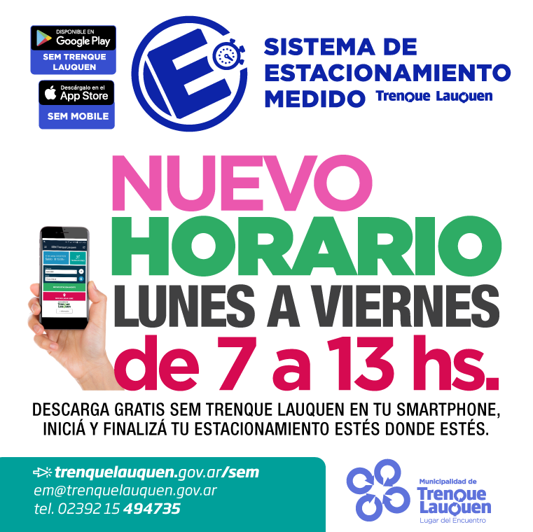 Registrese por única vez con su numero de celular, y descargue en forma gratuita e instale en su celular SEM Trenque Lauquen. Adquiera crédito para estacionamiento en los puntos de venta adheridos o con tarjeta de crédito y/o débito a través de Todopago.